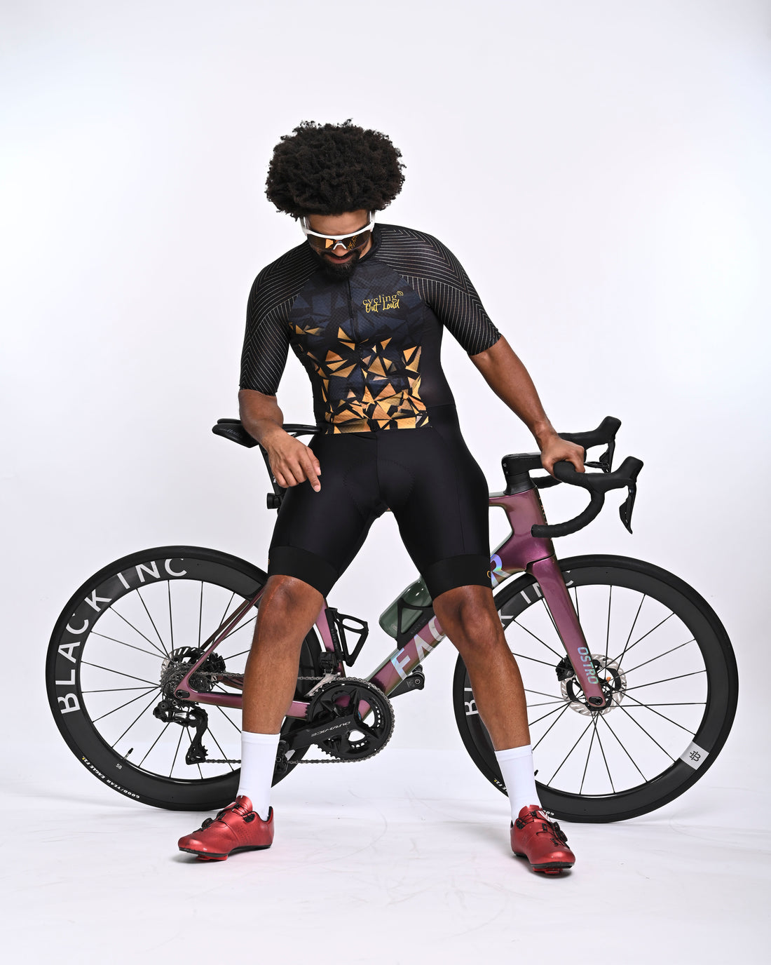 Dominate the road in style with our cutting-edge men's black and gold aero cycling skinsuit....