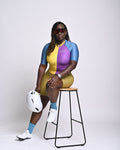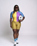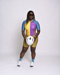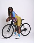 The Color Block'in cycling skinsuit isn't just another cycling skinsuit. It's a vibrant masterpiece, a symphony of speed and style. This aerodynamic skinsuit features a striking color-blocked design, combining bold yellow, rich purple, deep olive, and electric turquoise for a truly unique and eye-catching aesthetic.