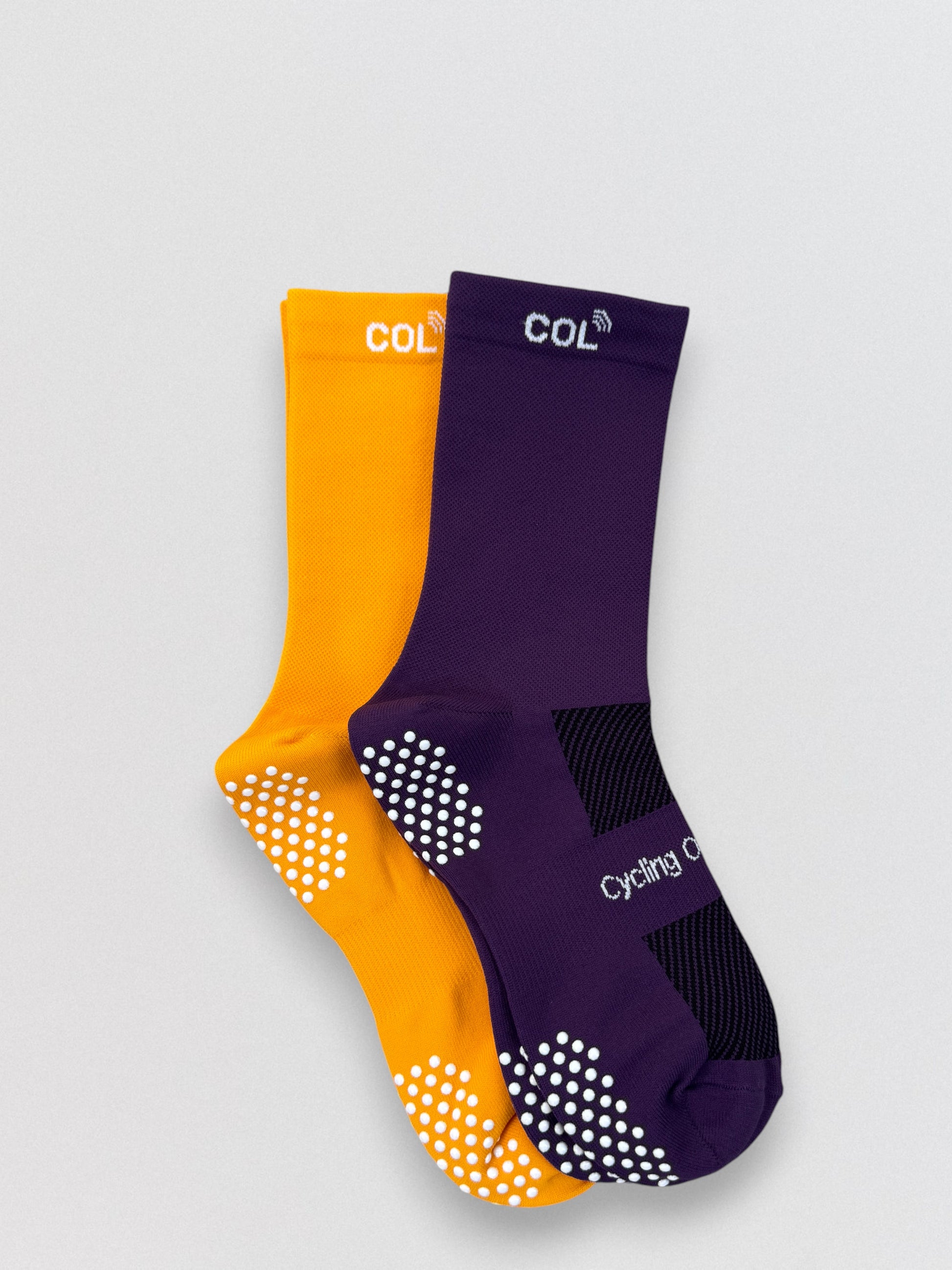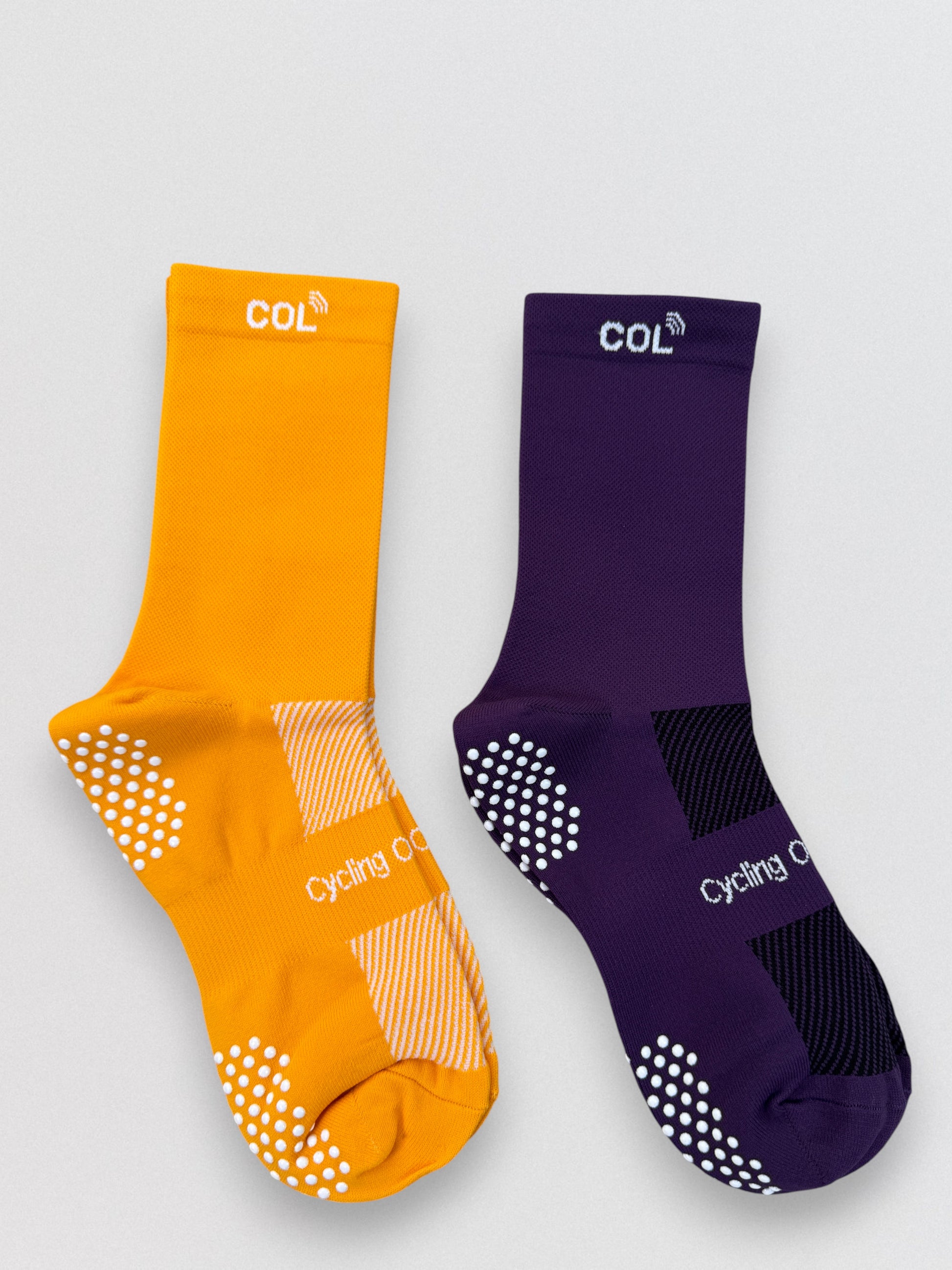 This purple & gold sock bundle will ensure you are ready for any ride. The bright colors are designed for performance and comfort, featuring moisture-wicking fabric that keeps your feet dry and odor-free. Our cycling socks offer firm compression and a thin profile for a responsive feel.
